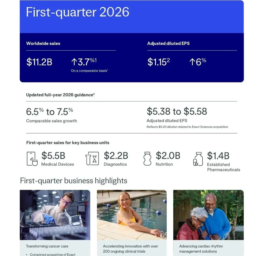 2026年第一季度,雅培报告销售额为111.6亿美元,同比增长7.8%,超出市场预期的110亿美元。调整后每股收益为1.15美元,同比增长6%,与分析师预期持平。按可比口径计算,包括Exact Sciences完整季度的影响在内,可比销售额增长3.7%。