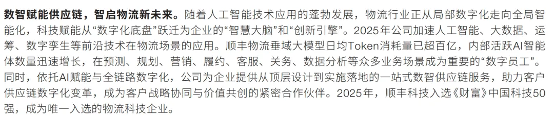 第一段如上图:大家都知道,现在已经进入人工智能时代,顺丰的AI智能体,在在预测、规划、营销、履约、客服、关务、数据分析等众多业务场景成为重要的“数字员工”顺丰的数智化转型有望进一步提升顺丰的运营效率、降低成本、增强服务质量,从而在市场竞争中占据更有利的地位。同时,一站式数智供应链服务也有助于开拓新的市场空间,实现业务的多元化发展。
