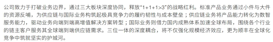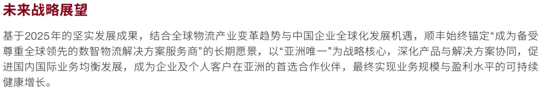 第二段如上图:顺丰的战略目标非常清晰:成为全球领先的数智物流解决方案服务商,以“亚洲唯一”为战略核心。聚焦在亚洲市场的唯一性,不可替代的地位。成为企业及个人客户在亚洲的首选合作伙伴。