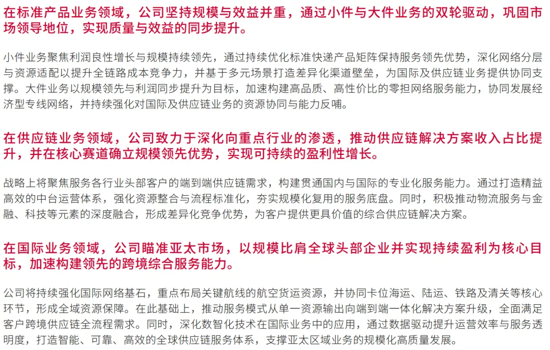 具体举措:小件业务聚焦质量与规模,通过优化快递产品矩阵、深化网络布局与资源适配提升全链路成本竞争力,基于多元场景打造差异化渠道壁垒,为国际及供应链业务提供协同支撑。大件业务以规模与利润同步增长为目标,加速构建高品质、高性价比的零担网络服务能力,协同发展经济型专线网络,强化国际及供应链业务的资源协同与能力反哺。