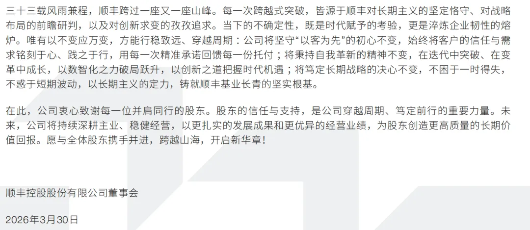 我们看一下顺丰财报中致股东的信。