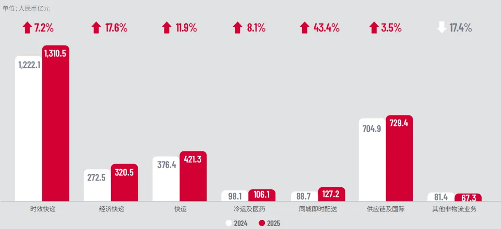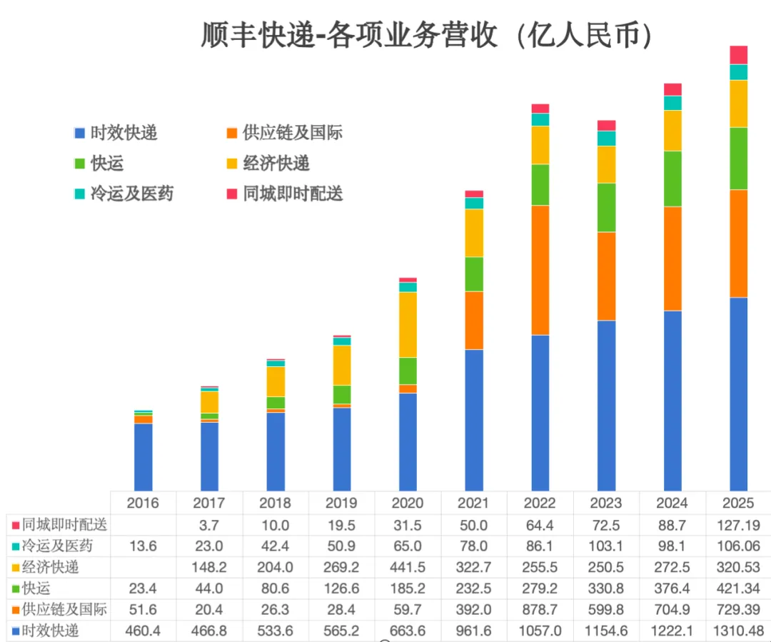 快运:2025年营收421亿,占比保持在13.67左右。已成为支撑营收的第三大支柱;冷运及医药:营收增长超7.8倍,13亿→106亿,占比稳定3%-4%左右,这是一个高壁垒、高增长的专业赛道,符合消费升级和健康产业发展趋势;同城即时配送:2025年为127亿,占比达4.3%,抓住了本地生活和新零售的市场机遇,是业务生态的重要补充。