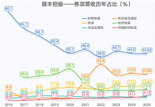 结论:这反映了顺丰主动的战略选择。在激烈价格战中,公司可能更倾向于挑选合适利润的经济件份额,将更多资源聚焦于高价值的时效件、快运和供应链业务,以提升整体盈利质量,但是2024年和2025年都是增长的,同时也反映出,大家对经济快递的要求不断提高,未来这一块,很有可能顺丰会不断抢占其他快递的市场。
