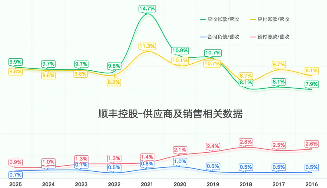 依据财务报表进行上下游析,如下图所示:上下游分析,因为在之前的文章分析过,只贴出最新的统计图,详见文章:顺丰控股深度分析:稳固的基本盘与充满想象力的国际业务,2025年基本没有很大变化,持续稳定