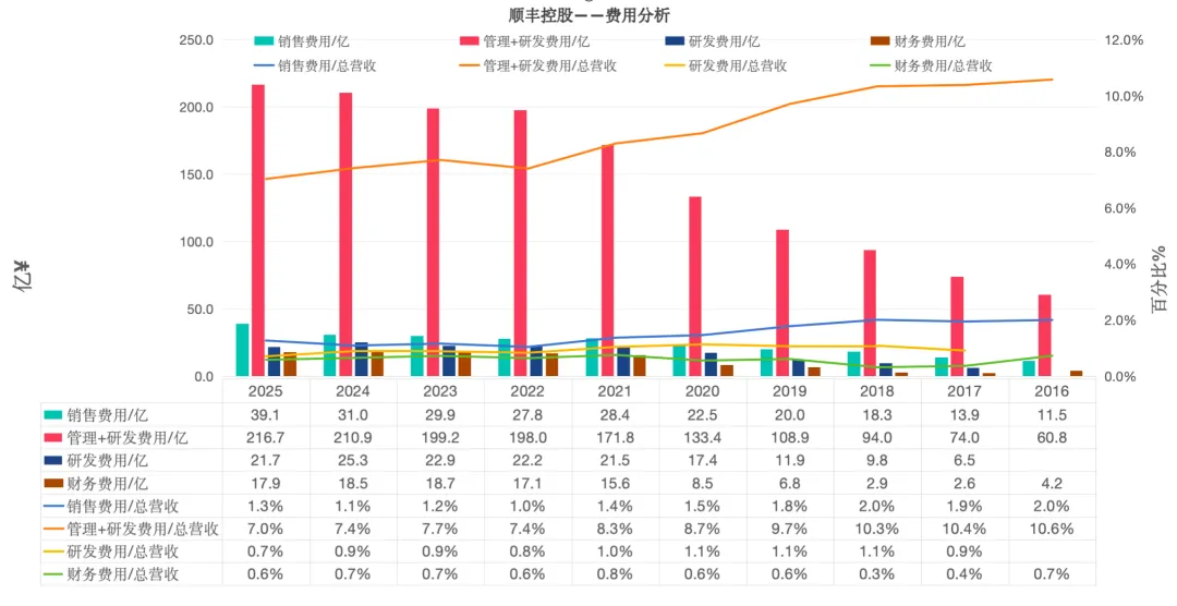 费用分析,如下图所示:因为在之前的文章分析过,只贴出最新的统计图,详见文章:顺丰控股深度分析:稳固的基本盘与充满想象力的国际业务,2024年和2025年对比,变化主要有以下几点: