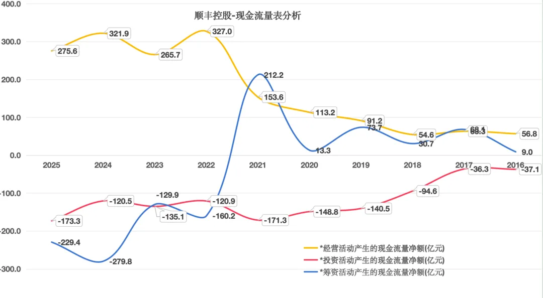 2025年顺丰控股自由现金流=经营现金流-资本支出=276亿-96亿=179亿。