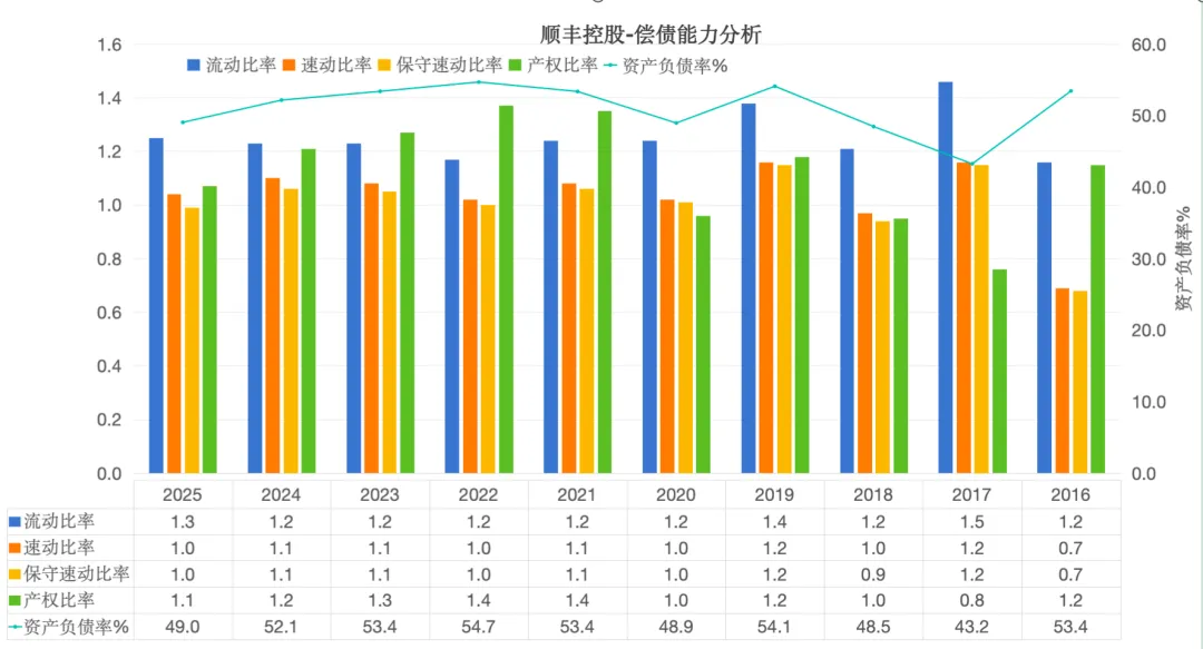 2025年流动比率为1.3,速动比率为1,虽然低于传统的安全线,但是物流行业,轻存货,回款快,流动比率和速动比率指标数值的实际影响弱。顺丰目前的现金流储量非常丰富,保守流动比率为1,表明短期偿债的资金充足。
