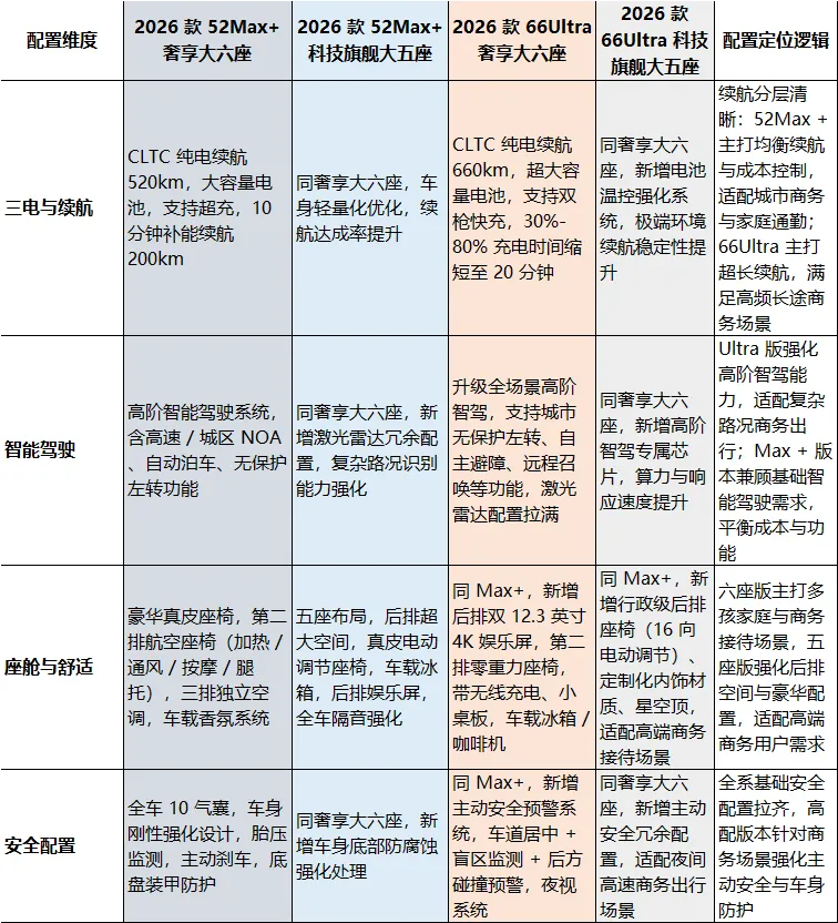 从配置矩阵来看,智己LS8 的产品策略明确:以52Max+科技旗舰大五座为核心走量款,兼顾续航、空间与豪华配置,适配B端商务与C端高端家庭用户;66UItra版本则作为顶配旗舰,主打超长续航与极致豪华体验,满足高端商务用户的差异化需求。
