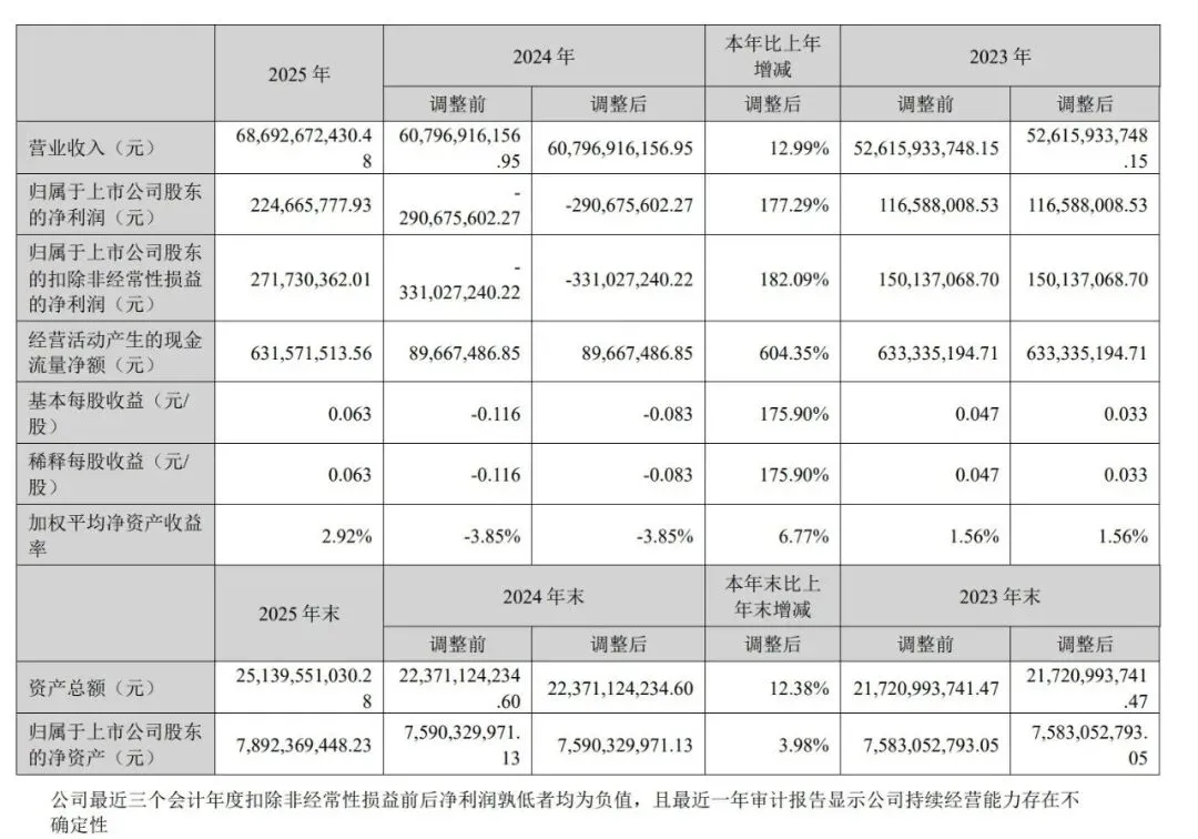 营收与利润:2025 年营业收入为 686.93 亿元,同比增长 12.99%;归母净利润 2.25 亿元,上年同期为亏损 2.91 亿元 。