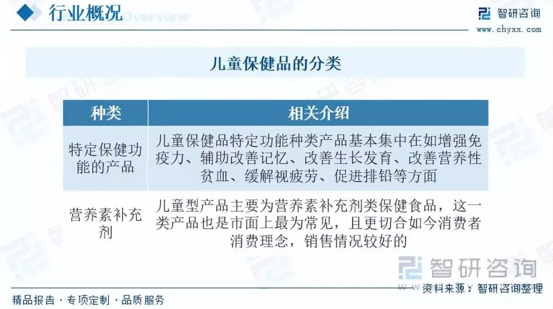 与保健品的分类基本相同,儿童保健品也分为特定保健功能的产品和营养素补充剂两大类。第一类,儿童保健品特定功能种类产品基本集中在如增强免疫力、辅助改善记忆、改善生长发育、改善营养性贫血、缓解视疲劳、促进排铅等方面。第二类,儿童型产品主要为营养素补充剂类保健食品,这一类产品也是市面上最为常见,且更切合如今消费者消费理念,销售情况较好的。