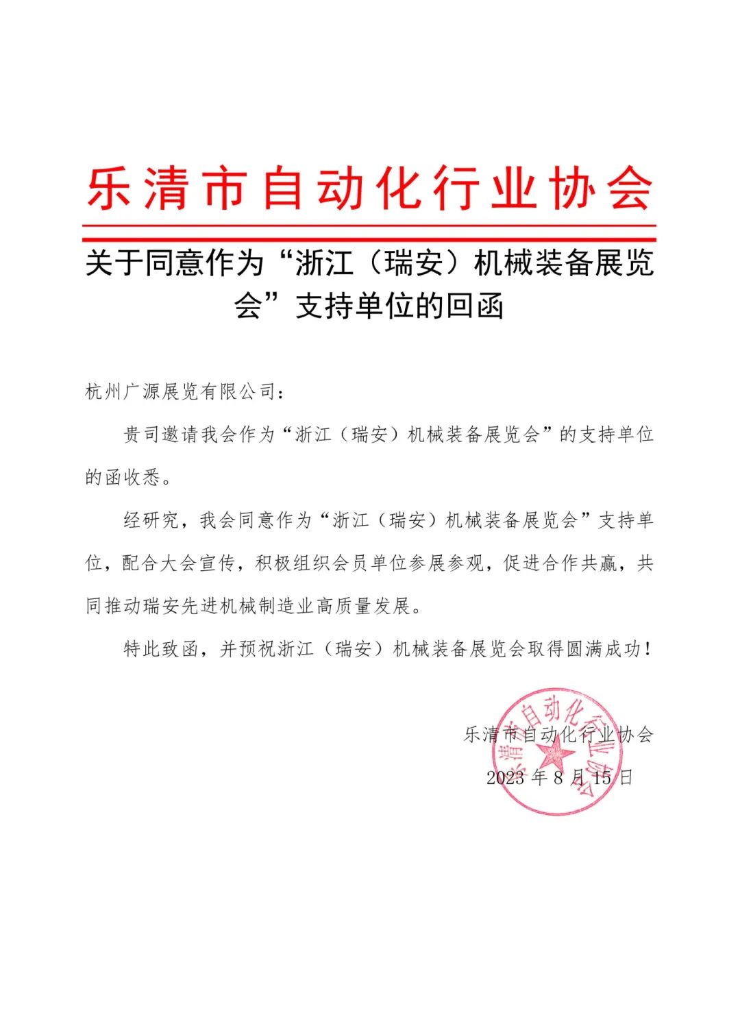 乐清市自动化行业协会正式发函作为浙江(瑞安)机械装备展览会支持单位