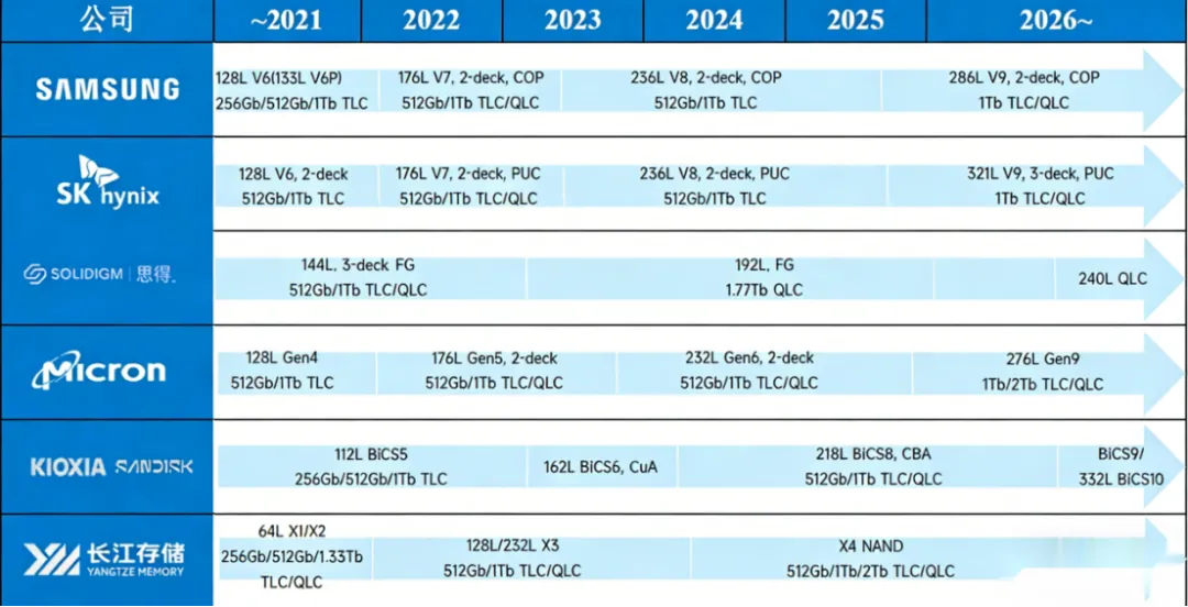 在战略格局上,各参与者出现了分化,韩厂(三星、SK海力士)垂直整合+激进扩产,SK海力士M15X工厂、三星平泽第五工厂(2028年量产)等重大项目推进;美厂(美光)聚焦高端HBM和数据中心SSD,与英伟达深度绑定;中国厂商(长江存储、长鑫):差异化竞争,在主流NAND和DRAM领域寻求突破。
