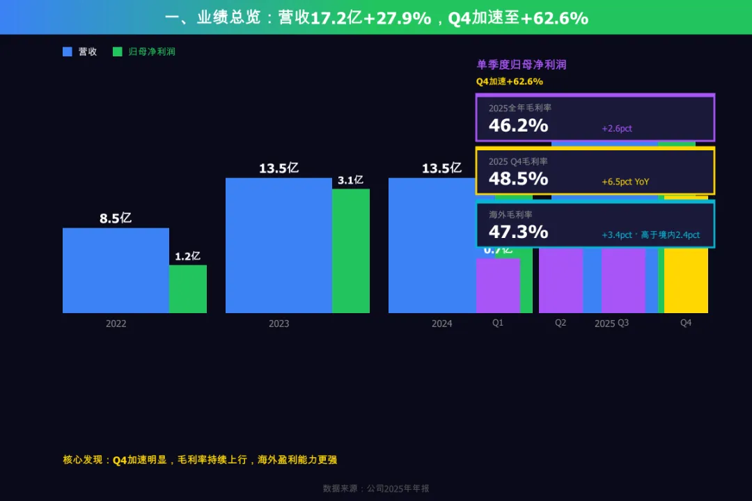 全年营收17.2亿元,归母净利润4.3亿元,毛利率46.18%——这组数字放在A股不算炸裂,但拆开季度来看就很有意思了。