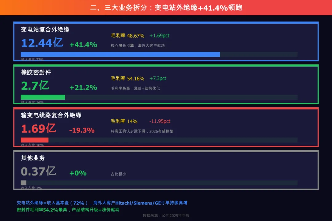 变电站复合外绝缘是公司绝对的收入基本盘,2025年营收12.44亿元,同比暴增+41.4%,占比72%。毛利率48.67%,还在往上走。驱动来自Siemens、ABB、日立在海外变电站新建和改造项目里的持续放量。
