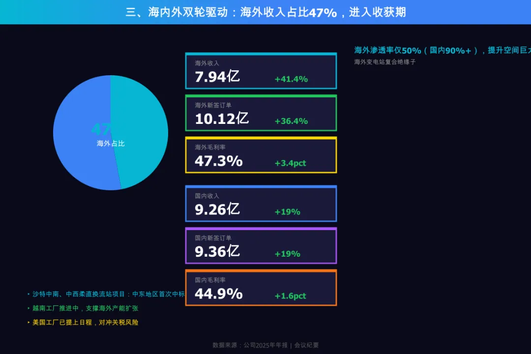 这是年报里最值得细看的一条线——海外收入正式突破47%,新签海外订单10.12亿元,同比增长+36.4%。海外毛利率47.3%,高于境内约2.4个百分点,高增长和高盈利同时出现。