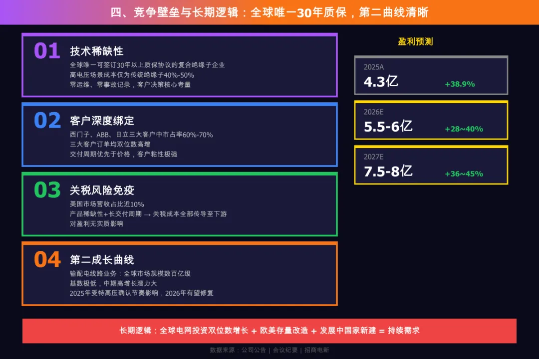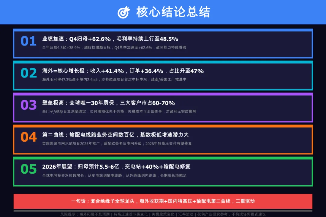 核心结论:2025是海外业务收获期的元年。变电站外绝缘在手订单充足,沙特柔直打开了中东大门,越南和美国工厂布局中长期增长空间。密封件毛利率54%且仍在提升,是被低估的利润贡献点。全球电网投资正处在一个双位数增长的大周期里,而这家公司是目前全球范围内极少数具备30年持续供货能力的复合绝缘子供应商。