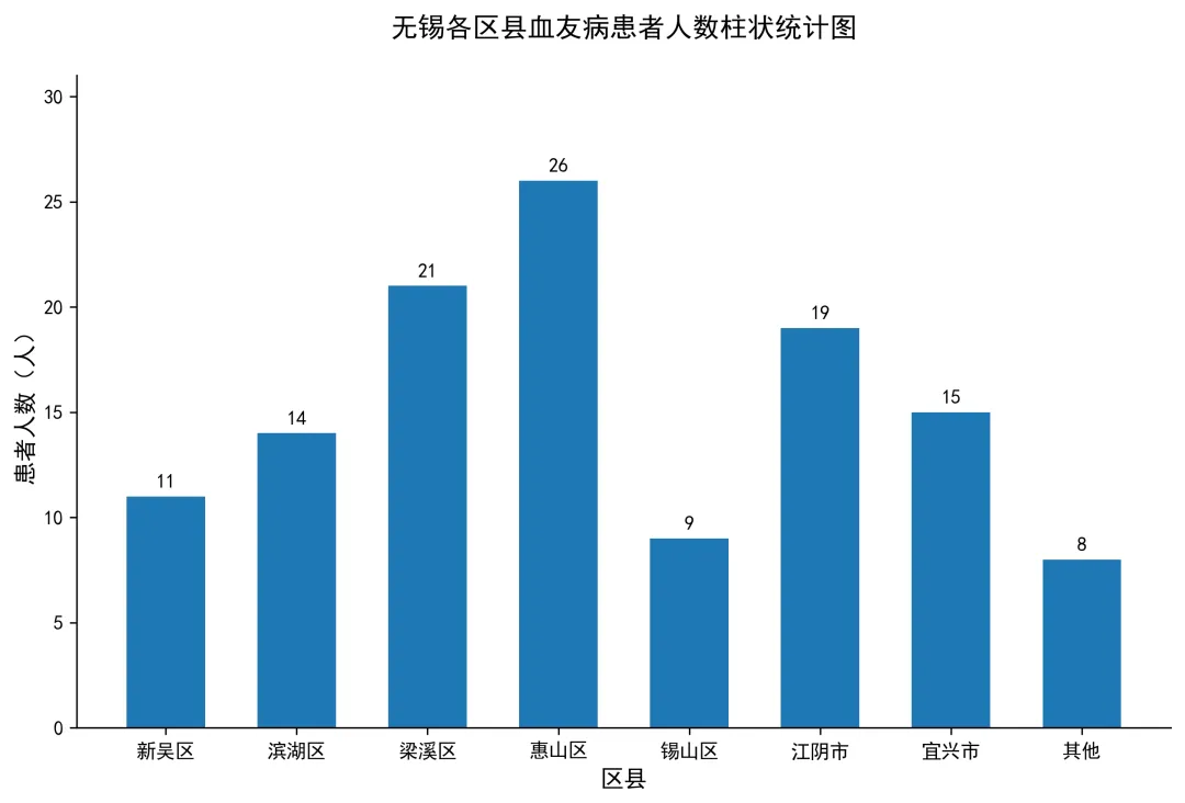 患者广泛分布于无锡各行政区域,其中:惠山区26人、梁溪区21人、江阴市19人、宜兴市15人、滨湖区14人、新吴区11人、锡山区9人、其他地区8人。患者分布与区域人口基数有一定相关性,但数据也提示需关注偏远或农村地区的患者可及性。(见图7A)