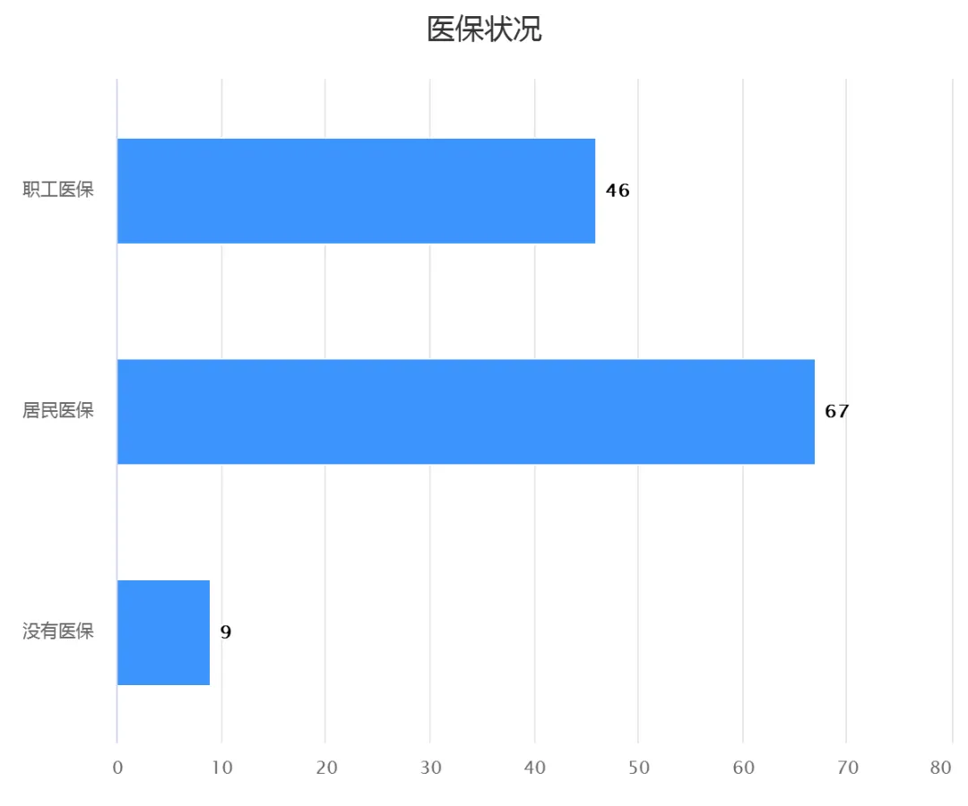 - 医保覆盖:职工医保覆盖46人(37.7%),居民/学生医保覆盖67人(54.9%),新农合/无医保者9人(7.4%)。基本医疗保险覆盖率达92.6%,但保障水平存在差异。(见图12、图13)