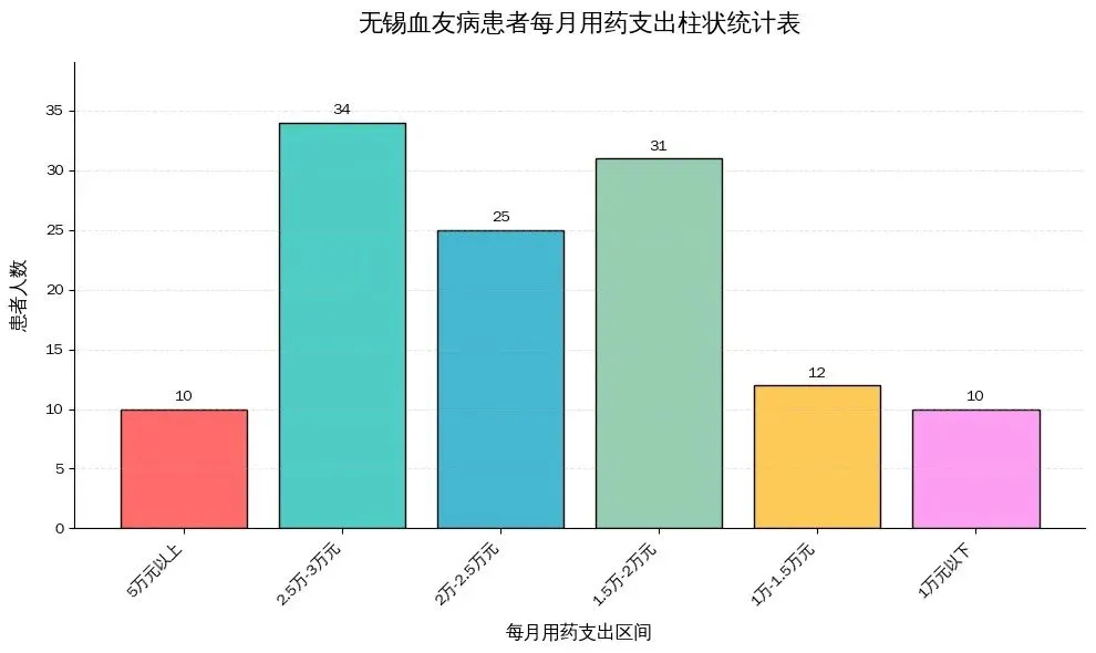 - 月度药费支出:患者经济负担沉重。月度药费支出超过1.5万元的患者高达100人,占总数的82%。其中,支出2.5万元以上的有44人(36.1%),5万元以上的有10人(8.2%)。高昂的治疗费用是导致患者家庭“因病致贫、因病返贫”的核心风险。(见图14)
