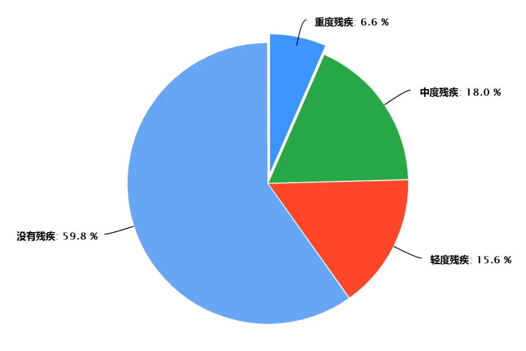 - 残疾情况:存在不同程度关节残疾的患者共49人,占40.2%(重度8人,中度22人,轻度19人)。残疾率与预防治疗普及率低直接相关。没有残疾的73人(59.8%)中,包含大量儿童、青少年患者,保护其关节功能刻不容缓。(见图15、图16)