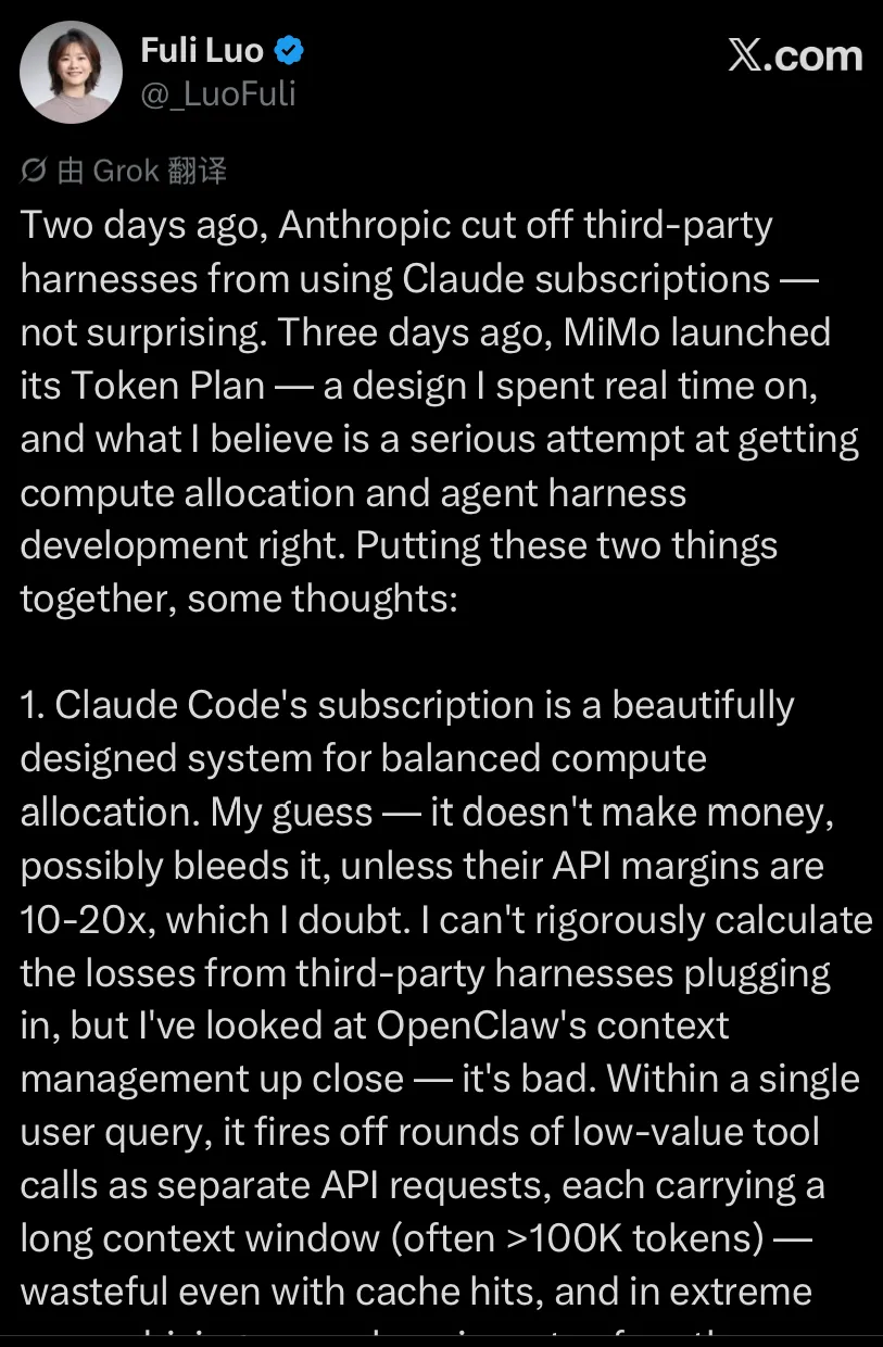 前段时间Hermes冲上榜单,在两个月内狂揽35k+ GitHub星标,这是由Nous Research于2026年2月发布的Agent,其与Open Claw的核心差异化正是Token效率。Open Claw是"网关"架构(hub-and-spoke),而Hermes采用"同心增长式架构"(concentric growth),强调持久记忆与自我进化,大白话说就是“长脑子了”。两者的关键差异在于架构逻辑,即Open Claw 是集中管控,适合团队协作,而Hermes Agent 是个人成长,适合长期陪伴。Hermes的缓存感知记忆架构冻结系统提示快照在会话初始化,因此重复模型调用使用缓存上下文窗口,防止学习循环膨胀token账单。早在今年3月的中关村论坛中,小米MiMo大模型负责人罗福莉就直接指出AI Agent时代的成本悖论:当大模型从"聊天"转向"干活",Token消耗量呈现10倍甚至100倍的爆发式增长,而现有的技术架构和商业模式难以支撑这种增长。这也与她后来4月6日在X上的呼吁完美契合,她将Anthropic封禁第三方Agent框架与MiMo推出的Token Plan并置分析,系统阐述了她对Agent算力分配与定价逻辑的深层思考,即Agent时代不属于烧掉最多算力的人,而属于用得最聪明的人。她认为未来一年AGI进程最关键的词,是"自进化"。而Hermes正是"用得更聪明"的典范,通过自我生成的Skills和高效的记忆管理,将token消耗集中在真正创造价值的地方。在Token效率为王上,它的出现与市场需求产生了微妙的共振。当前AI行业存在一个根本性的经济矛盾,训练成本持续飙升,推理成本断崖式下跌。根据斯坦福2025年AI指数,每百万token的推理成本在过去两年内下降了惊人的99%,从GPT-3时代的60美元降至2026年初的0.06美元。驱动这一降幅的是三股力量的相乘效应:硬件效率每年提升2~3倍,算法效率每年提升2~3倍,系统优化每年再提升2~4倍。三者相乘,Token成本每年下降5~10倍。然而,训练最先进的LLM已成为人类历史上最昂贵的资本密集型活动之一。Anthropic CEO Dario Amodei曾透露,2024年中期模型训练成本已达1亿美元,而训练中的模型成本接近10亿美元,预计2025年可能出现耗资百亿美元的训练项目。这对开源模型构成了致命威胁。你需要持续投入九位数人民币级别的训练成本(单次完整训练的折旧加电费),却无法通过模型本身直接收费回收。当你的权重文件免费挂在Hugging Face上,现金流回收路径只剩下一条,云上推理。但开源权重意味着客户可以自行采购GPU部署,根本不需要回到你的云平台。你越成功,你的商业模式就越失败。在此基础上,规模效应是失效。最典型的就是之前猝死的Sora,用户量越多,其毛利率越低,甚至赔本。但传统云计算的商业模式建立在规模效应之上,即随着客户数量增长,固定成本被摊薄,边际成本递减。Token经济学颠覆了这一逻辑。另一点是规模效应直接面临的冲突就是闭源和开源之争,比如DeepSeek曾披露其推理系统的理论成本利润率高达545%,但这建立在极致的算力优化和闭源模型的基础之上。对于开源模型提供者而言,规模效应带来的保障并不存在,客户可以"带走"你的技术成果,在任何有云算力的地方部署。事实上,Qwen系列模型在Hugging Face下载量突破6亿次,成为全球仅次于Llama的开源力量。但技术成功的另一面是商业困境:当模型能力差距缩小,用户通过多模型比较的需求自然下降;当开源权重让客户可以自建AI infra,云厂商的推理收入被直接侵蚀。在Agentic时代,是否面临定价权丧失的问题?《金融时报》的报道用一句话带过了核心事实:"MaaS(模型即服务)目前占比很小,且因竞争激烈而低毛利"。随后迅速跳转到agentic AI带来token消费爆发的乐观叙事。但这句轻描淡写的背后,是一个被掩盖的残酷现实,即国内大模型API的价格战已经将单token毛利打到接近成本线。DeepSeek、字节豆包、百度文心一言的轮番降价,让MaaS变成了"赔本赚吆喝"的生意。豆包大模型1.6在2025年6月的价格降至0.8元/百万tokens(输入),成本比上一代下降63%。而agentic应用即便消耗再多的token,乘以一个趋近于零的单位毛利,结果依然是零。更严峻的是,新一代推理模型(如DeepSeek R1)消耗的计算量是传统推理的150倍,模糊了训练与推理的边界。当模型在内部进行大量隐式推演(用户看到一个token,模型内部可能已生产上百个),单个可见token的成本被思考过程成倍放大。在 ChatGPT 时代,月度订阅(如 ChatGPT Plus 的 20 美元/月)是主流商业模式,其假设是用户的 Token消耗相对均匀,订阅收入能够覆盖服务成本。然而,Agent 时代的到来彻底颠覆了这一假设:同一用户在不同场景下的Token 消耗可能相差百倍,固定订阅价格无法反映这种差异,导致严重的交叉补贴和效率扭曲。MaaS(模型即服务)模式的必然性在于其按需付费的定价机制,能够更准确地反映Token消耗的实际成本和价值。用户为实际使用的Token付费,服务提供商根据Token类型(输入/输出、模型能力等级)差异化定价,实现成本与收益的精准匹配。这一模式对Agent经济尤为重要,即企业客户可以根据业务需求灵活调整 Token 使用量,避免为闲置能力付费;服务提供商则可以根据成本结构优化定价,实现可持续的盈利。MaaS模式的成功不仅取决于定价机制,更取决于Token效率的持续提升,如果单位Token的成本不能有效降低,按需付费可能导致客户的使用成本过高,抑制需求增长。罗福莉提出的核心解决方案,是“更省Token的 Agent框架”与“更强大和高效的模型” 的协同进化(co-evolution)。不是孤立地优化框架或模型,而是将两者作为相互反馈的系统,