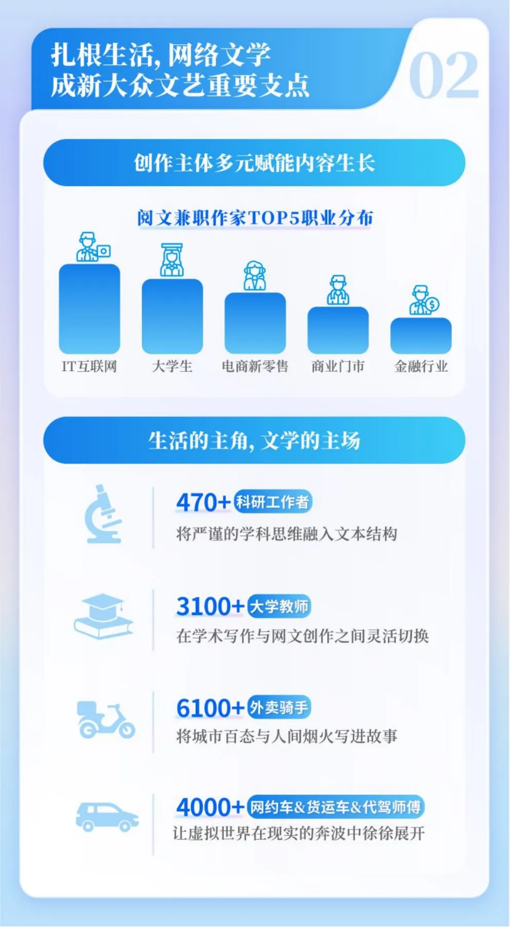 有殿堂之荣,也有市井之声。报告认为,凭借显著的参与广度,网络文学成为了新大众文艺的重要支点。来自阅文集团的一组数据非常具有代表性,其兼职创作的作者行业分布TOP5依次为IT互联网、在校大学生、电商新零售、商业门市及金融行业。超470位科研工作者,将严谨的学科思维融入了文本结构;3100多位大学教师,在学术写作与小说创作之间灵活切换;6100余名外卖骑手,将人间烟火写进故事,而4000多名网约车司机、货运车司机与代驾司机,则让虚拟世界在现实奔波中徐徐展开,“创作群体的全面扩展与职业背景的高度多元化,让网络文学的内容创作真正做到扎根生活、贴近大众”。