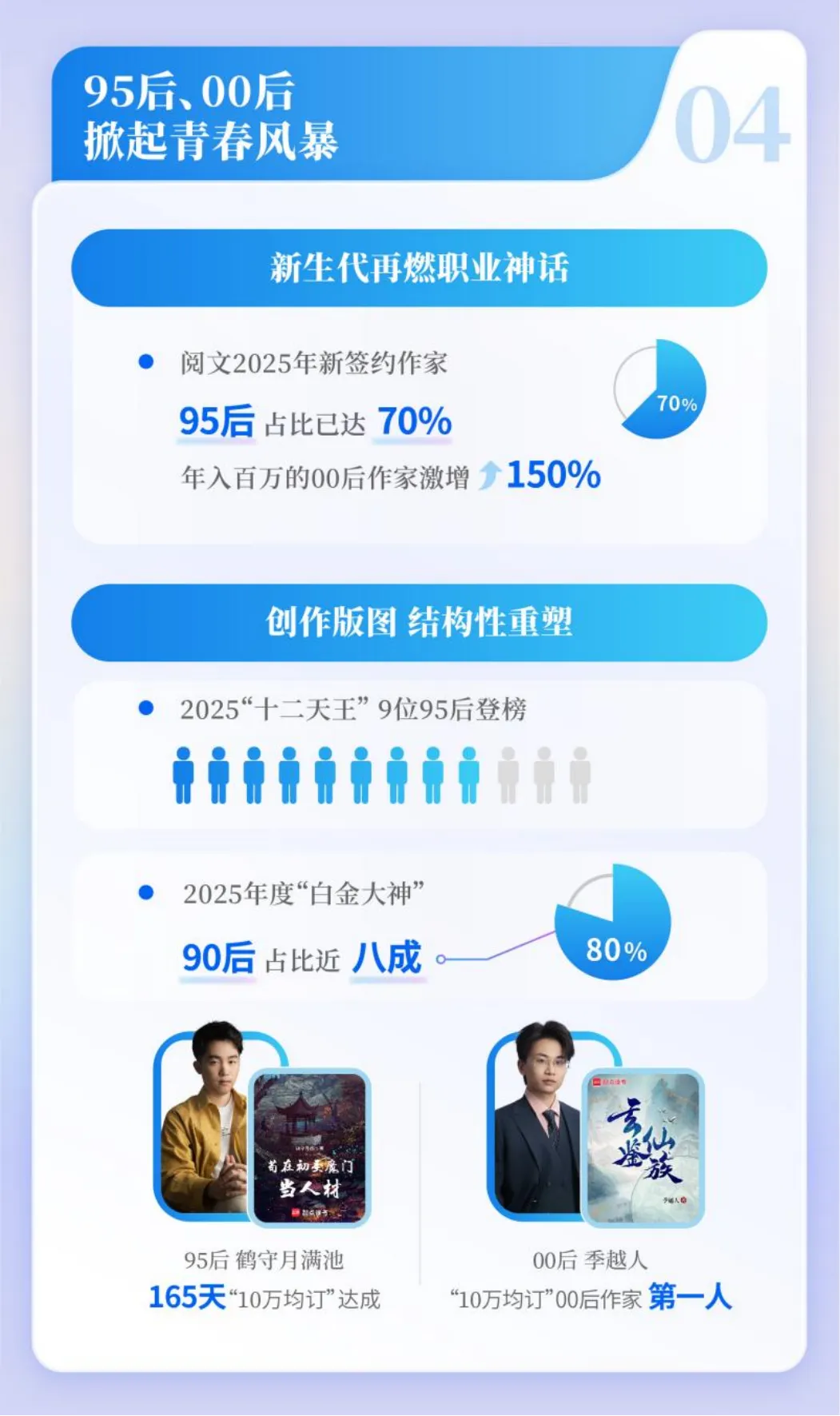 值得关注的是,95后、00后掀起的青春风暴,正在从读写两端推动行业革新。新生代的领导力日益彰显,在有风向标意味的年度“十二天王”评选中,95后作家占据九席;而新增“白金大神”序列中,90后作家占比已近八成。