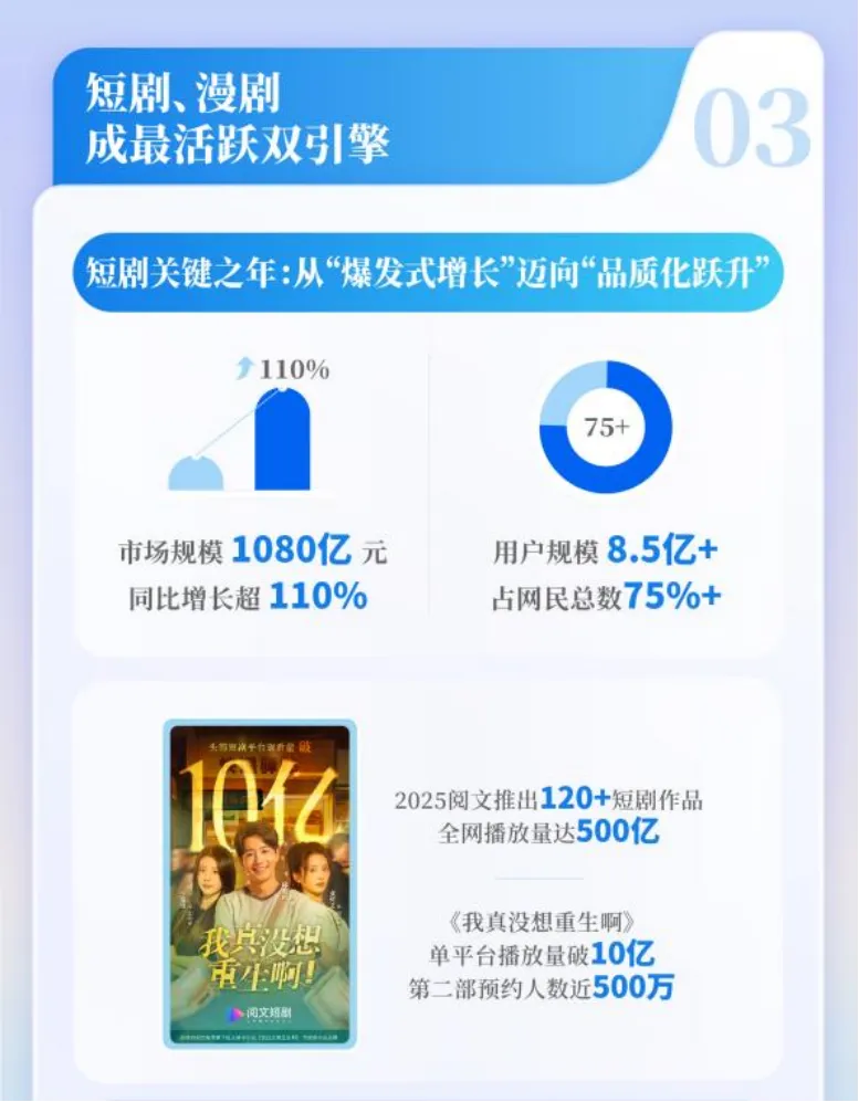 报告同样关注到短剧、漫剧的爆发,肯定二者是“网络文学IP转化新兴领域里的最活跃双引擎”。报告认为,在2025,短剧实现了从“爆发式增长”到“品质化跃升”的进阶,全年市场规模达1080亿元,同比增长超110%;而漫剧则成为“年度最热内容业态”,形成千亿想象、百亿规模的产业格局。