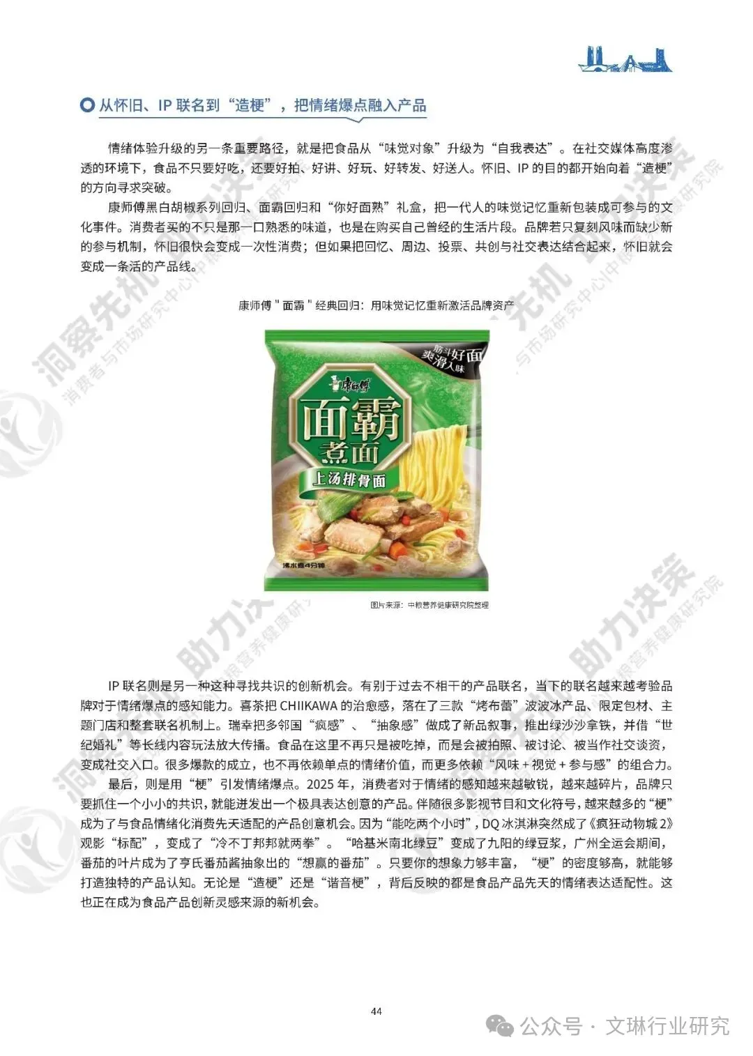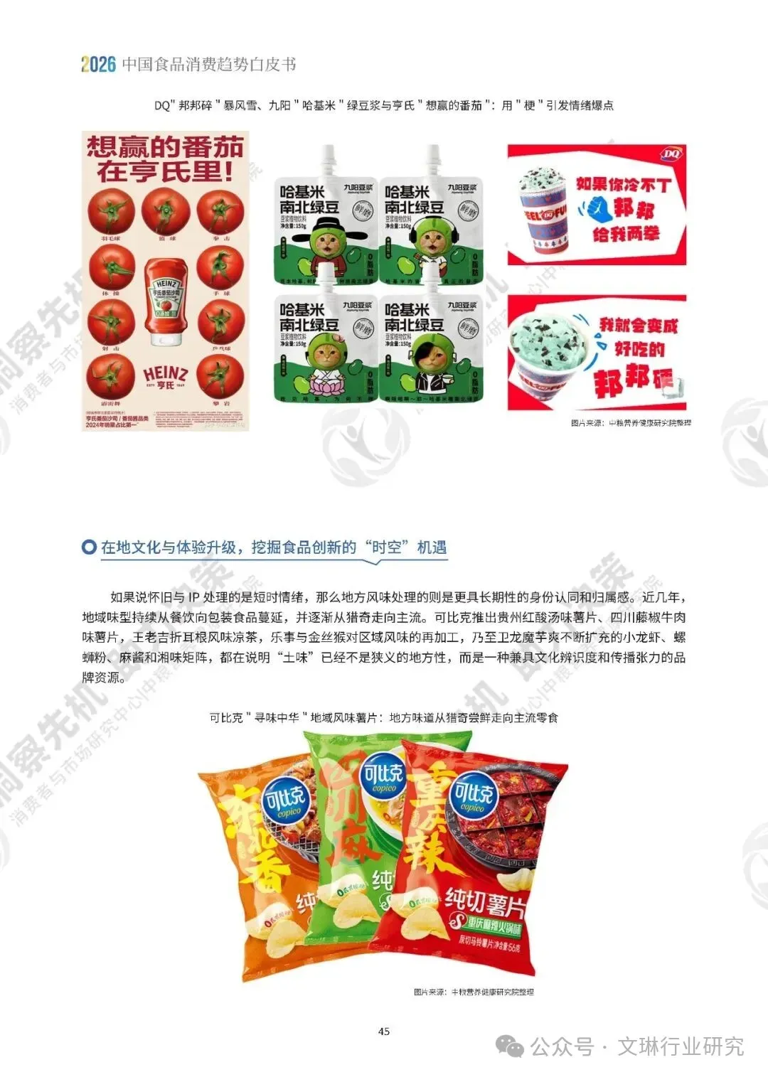 情绪与感官体验的升级,让食品有了更丰富的价值维度。在快节奏的生活里,食品成了大多数人最低门槛、最即时的情绪调节工具。一杯饮品,一包零食,一款限定口味,就能完成一次微小的情绪修复。食品消费接住了普通人最细碎的情绪诉求,疗愈价值被无限放大。从怀旧味觉记忆的唤醒,到 IP 联名的情绪共振,再到网络热梗的创意融合,食品不再只是单纯的味觉对象,更是年轻人的社交货币,是自我表达的载体。在地文化的深度挖掘,文旅场景的深度融合,也让食品创新找到了时空维度的新机遇,地方风味从猎奇尝鲜,一步步走向了主流消费市场。