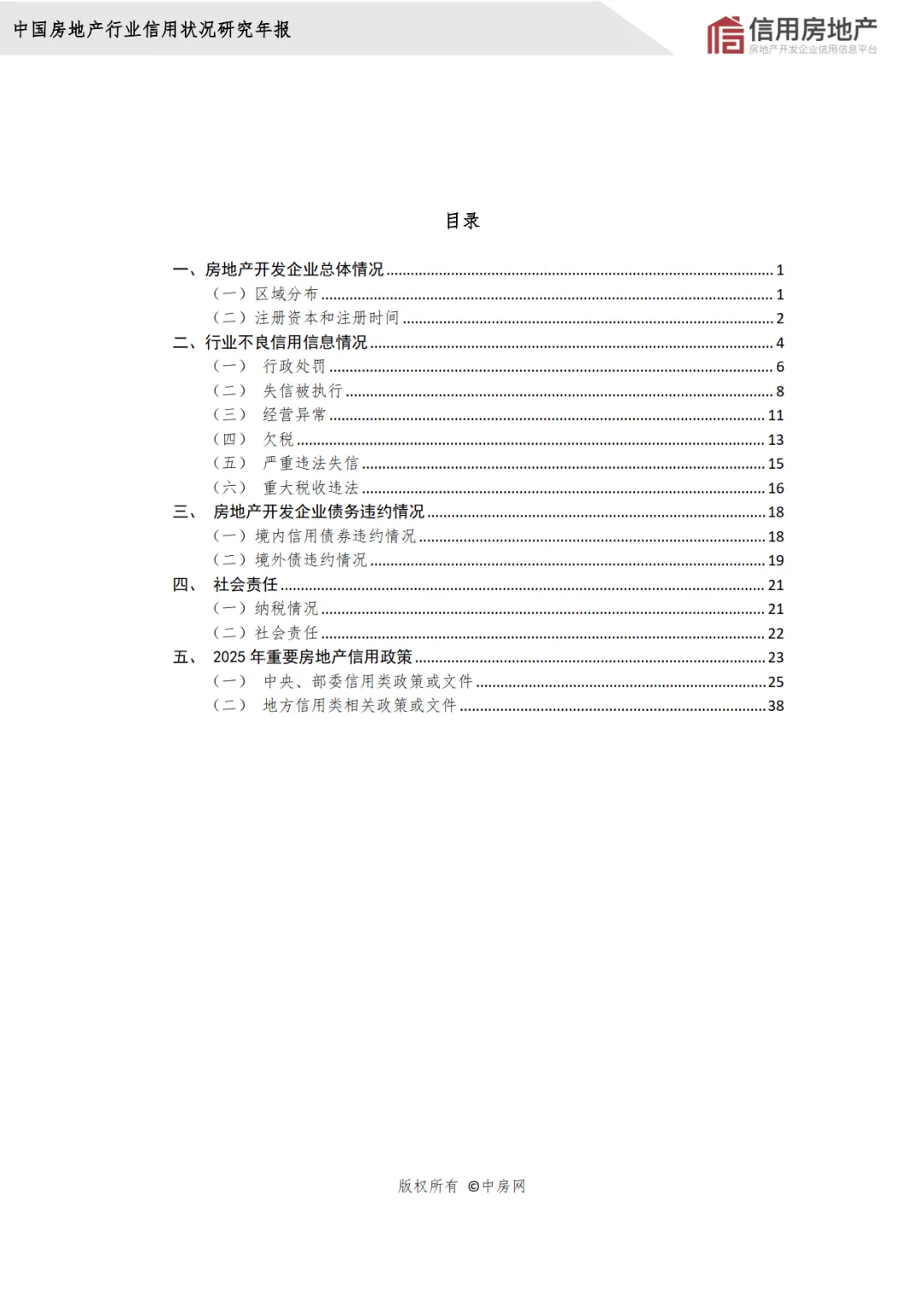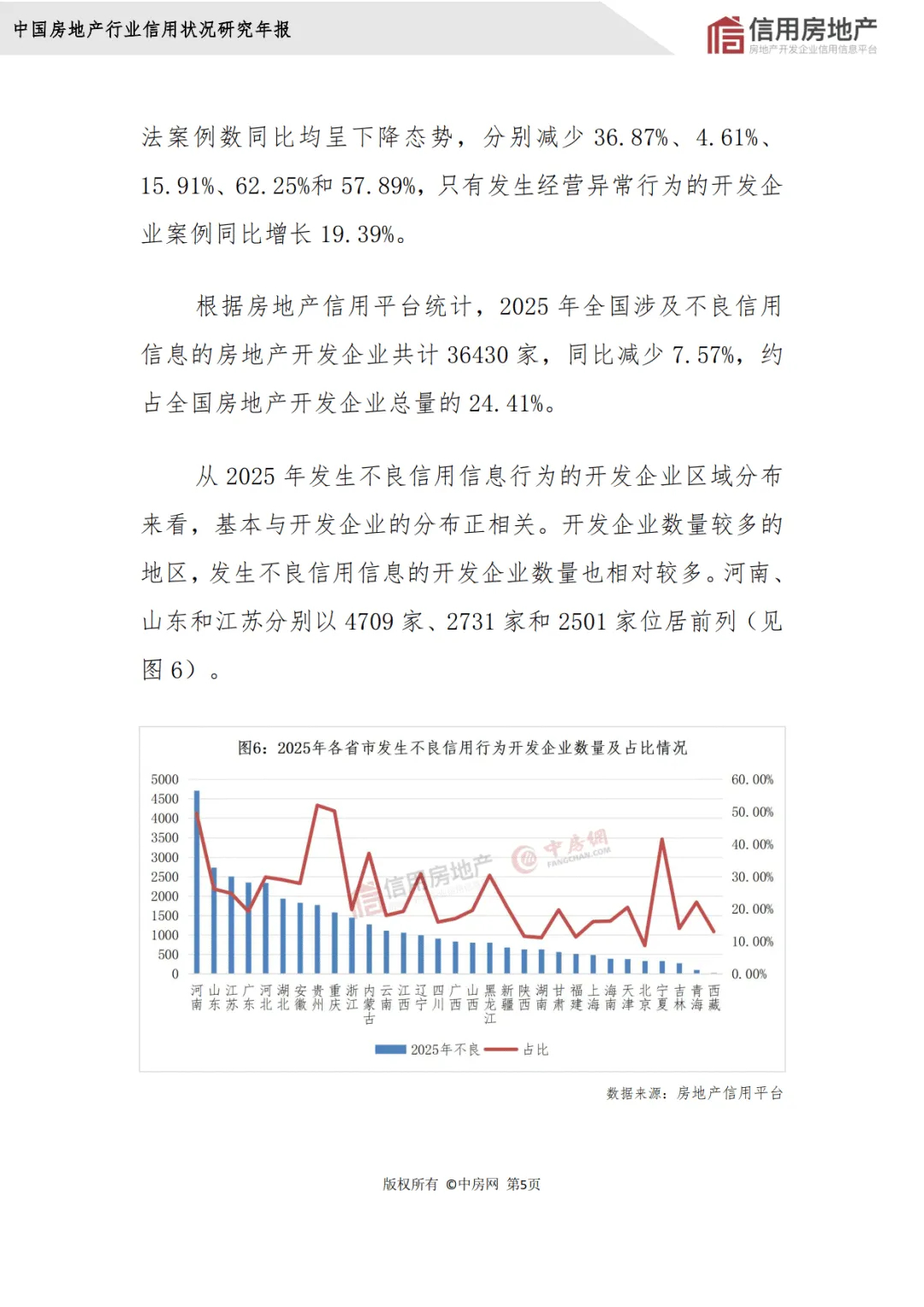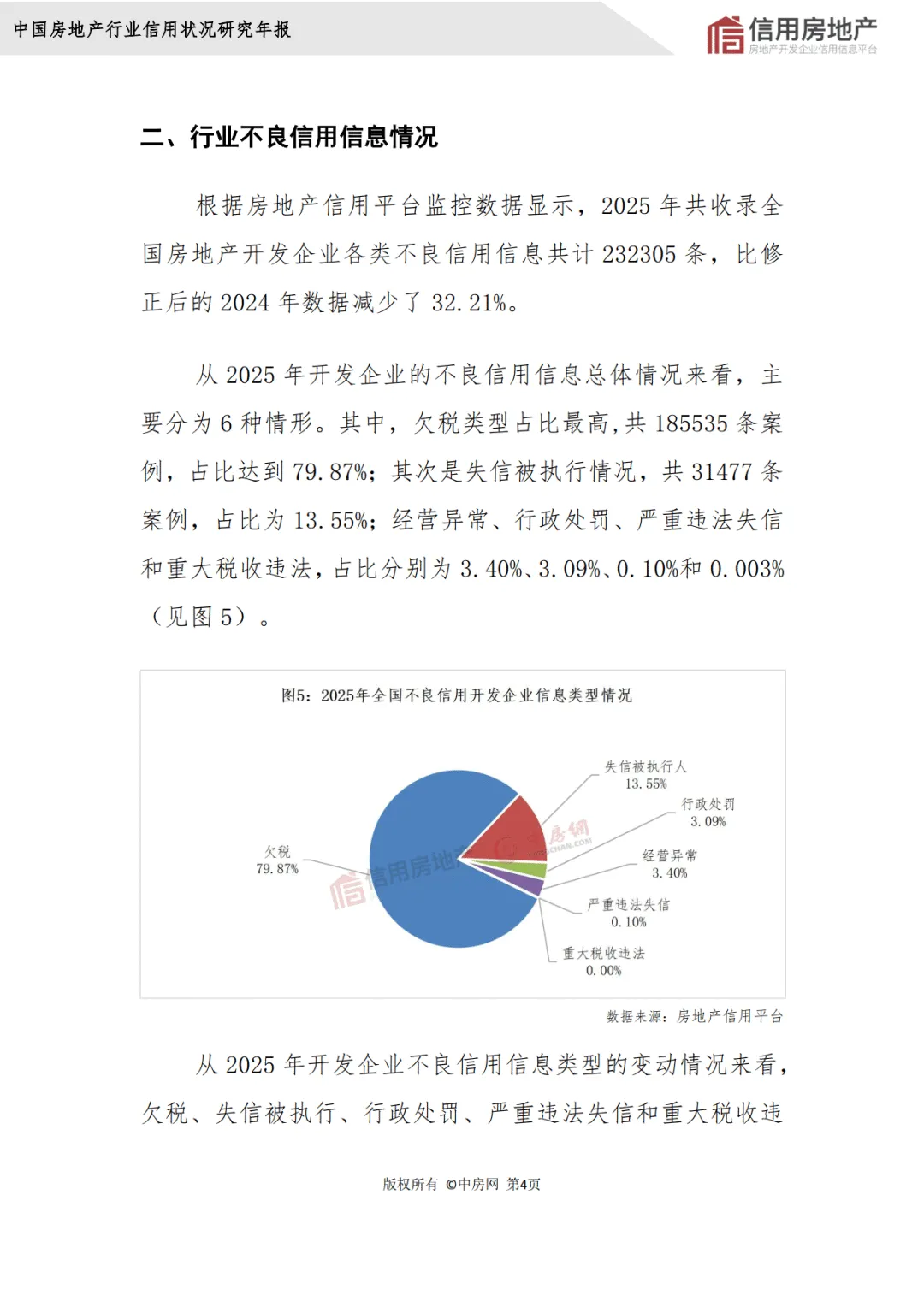2025 年房地产行业信用环境整体趋稳向好,不良信用信息总量同比下降,债务违约规模显著收缩,信用政策体系持续完善,行业信用建设迈向规范化、精细化。