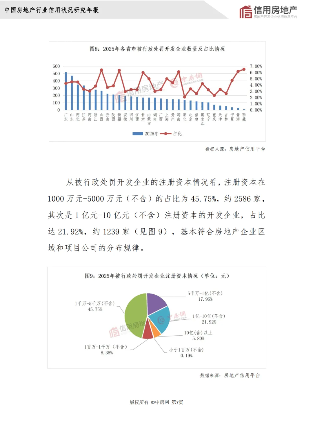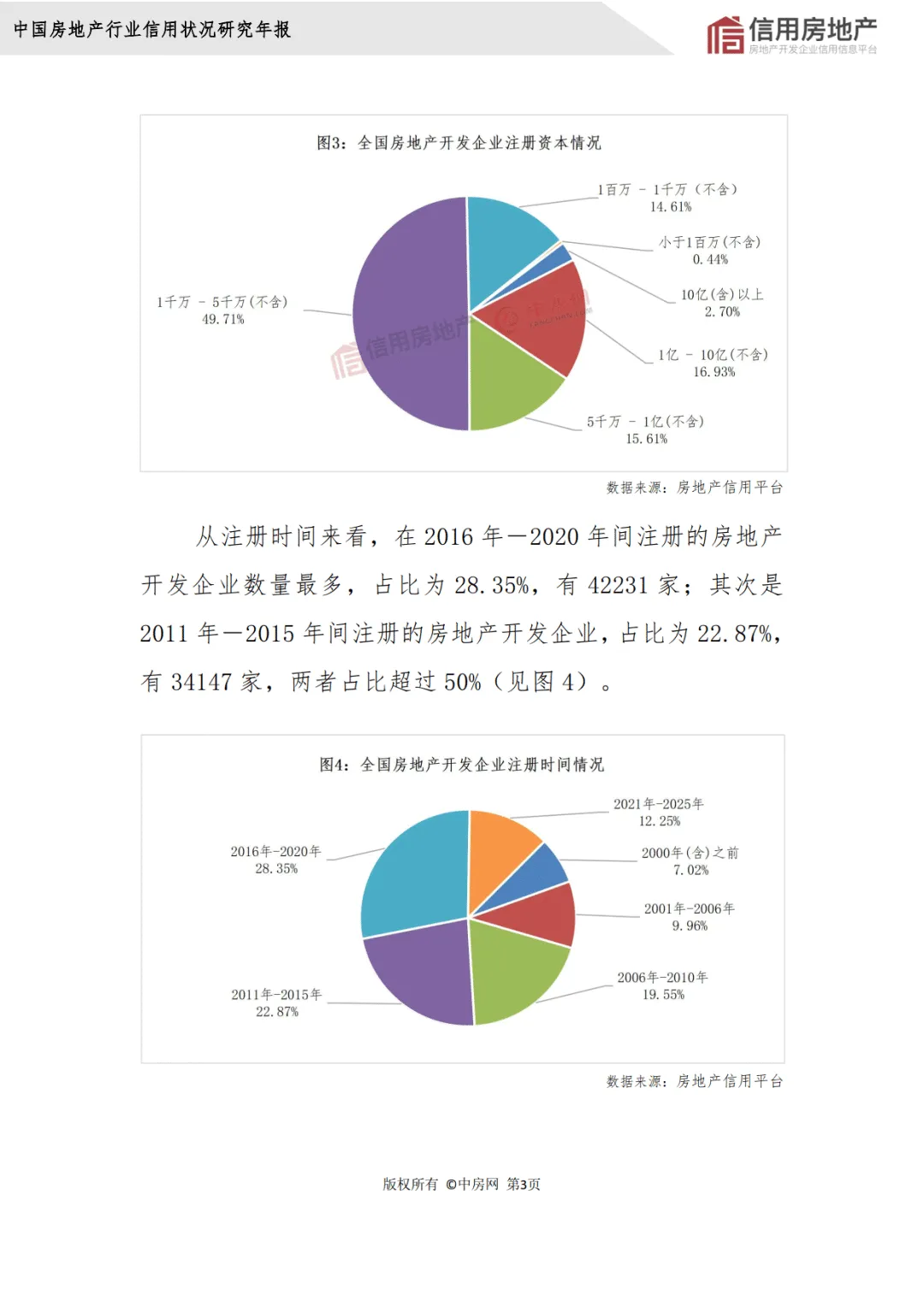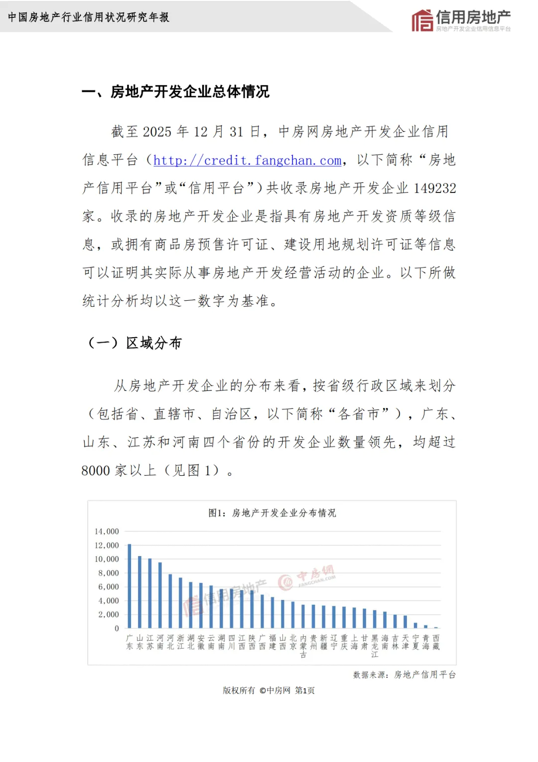 截至 2025 年末,中房网信用平台收录房地产开发企业 149232 家,区域集中于广东、山东、江苏、河南;注册资本以 1000 万 - 5000 万元为主,占比 49.71%;2016-2020 年为企业注册高峰期,行业主体结构以中小规模房企为主。