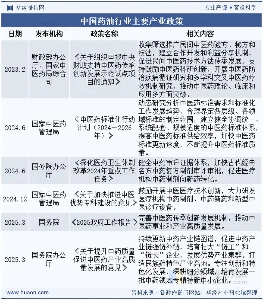 2025年3月,国务院办公厅印发《关于提升中药质量促进中医药产业高质量发展的意见》,提出持续更新中药产业链图谱,促进中药产业链强链补链,培育壮大“链主”和“链长”企业,发展优势产业集群。打造民族药特色产业高地。专注创新和特色化发展,深耕细分领域,培育发展一批中药领域专精特新中小企业。药油作为中医药的重要组成部分,近年来受到政策的大力支持。
