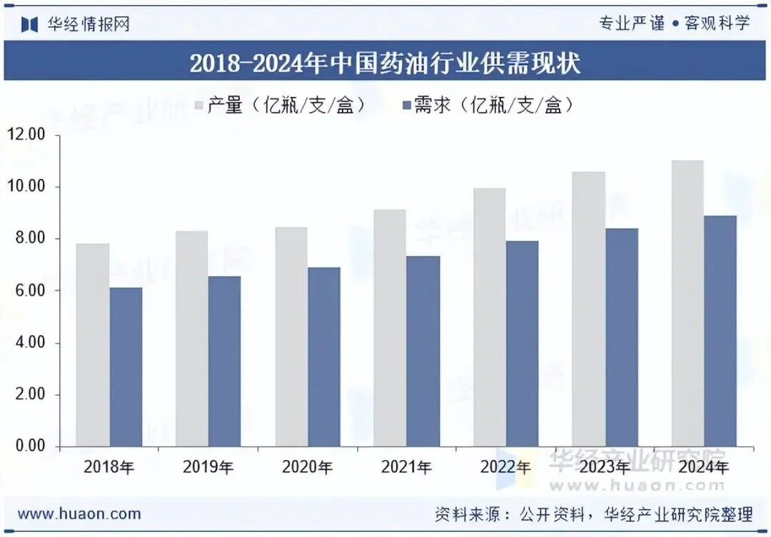 中国拥有悠久而丰富的药油使用历史,在中国的医药传统中,药油一直被视为一种重要的治疗和保健工具。据统计,截至2024年我国药油产量为11.05亿瓶/支/盒,需求量为8.9亿瓶/支/盒。未来,随着中药市场的进一步发展,预计中国的药油产能将继续增加,为消费者提供更多高品质、多样化的药油产品。
