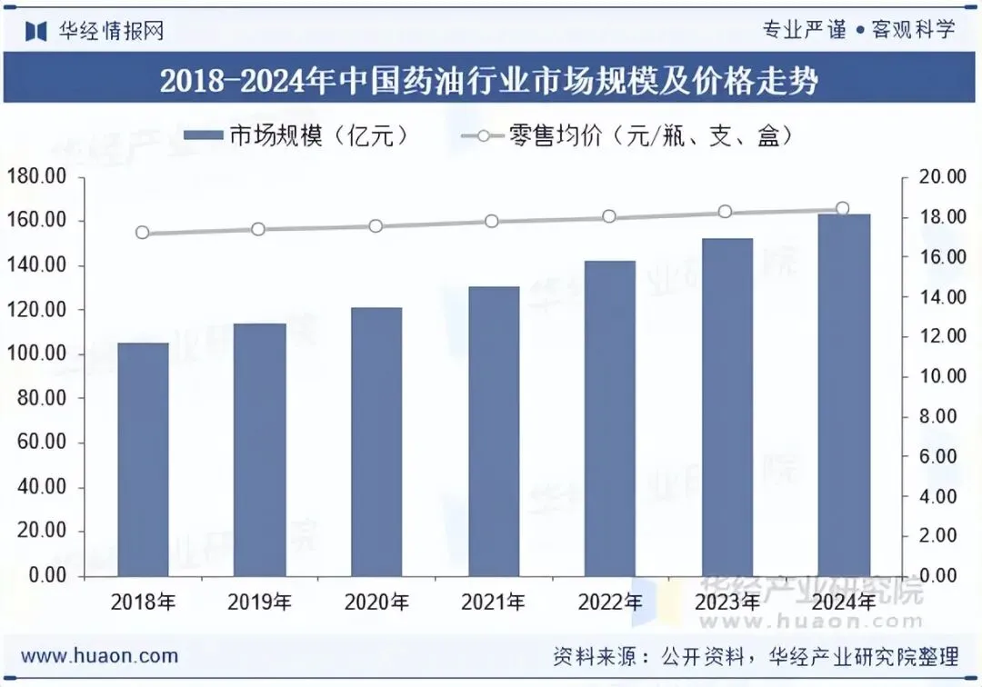 自2018年以来,中国药油行业一直保持着强劲的增长势头。数据显示,2024年我国药油行业市场规模达到163.37亿元,2018-2024年CAGR为7.6%;近年来,随着劳动力成本及生产原料价格的上涨,国内药油市场价格整体呈现增长态势,2024年药油行业市场均价为18.36元/瓶、支、盒。