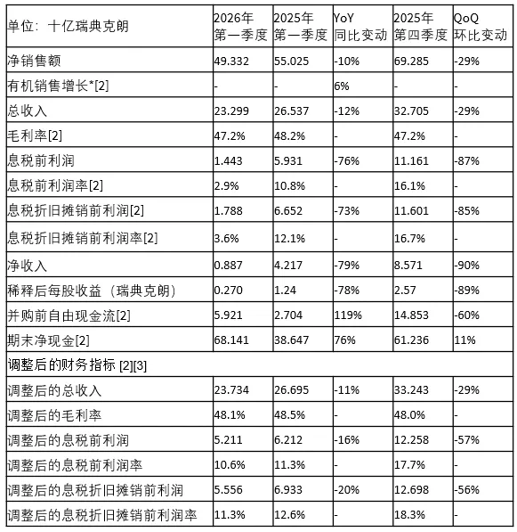 主要受汇率不利因素的影响,调整后[1]的息税折旧摊销前利润(EBITA)为56亿瑞典克朗,利润率为11.3%。受约38亿瑞典克朗重组费用的影响,息税折旧摊销前利润为18亿瑞典克朗。