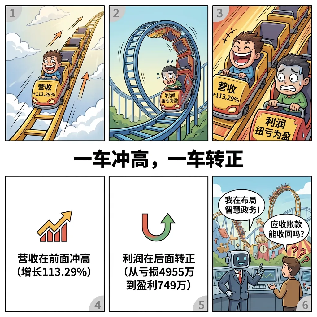 解读: 营收利润过山车:营收过山车(增长113.29%)在前面冲高,利润过山车(扭亏为盈)在后面转正。公司说:"我在布局智慧政务!"投资者问:"应收账款能收回吗?"