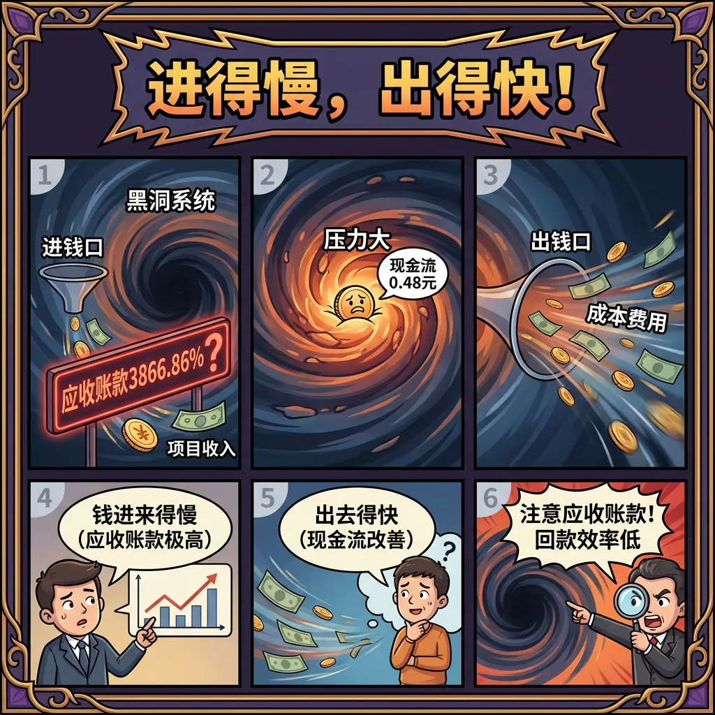 解读: 应收账款黑洞:钱进来得慢(应收账款3866.86%),出去得快(现金流0.48元)。黑洞压力大,回款效率低。投资者提醒:"注意应收账款!"