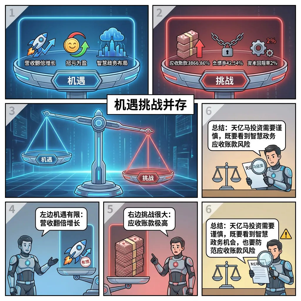 解读: 天亿马机遇与风险并存。机遇面:营收翻倍增长,扭亏为盈,智慧政务布局。风险面:应收账款极高,负债率较高,资本回报率低。适合能承受智慧政务行业波动的投资者。