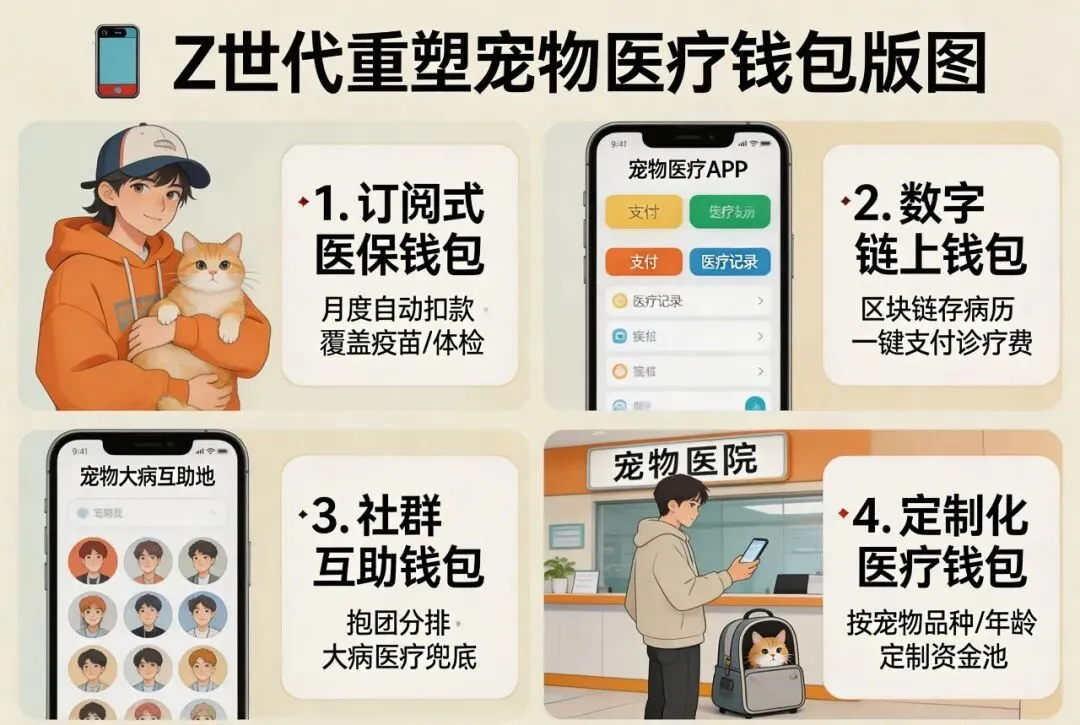 针对 Z 世代对信息透明、高性价比的核心诉求,行业涌现出明码标价的社区便民宠物医院、平价诊疗连锁品牌,同时宠物医保的快速普及进一步降低了诊疗门槛。2025 年宠物医保参保单量突破 500 万单,Z 世代参保用户占比达 76%。普惠透明化模式,不仅解决了传统模式中 “看病贵、定价乱” 的行业痛点,也推动了行业规范化发展,进一步释放了下沉市场的消费潜力。