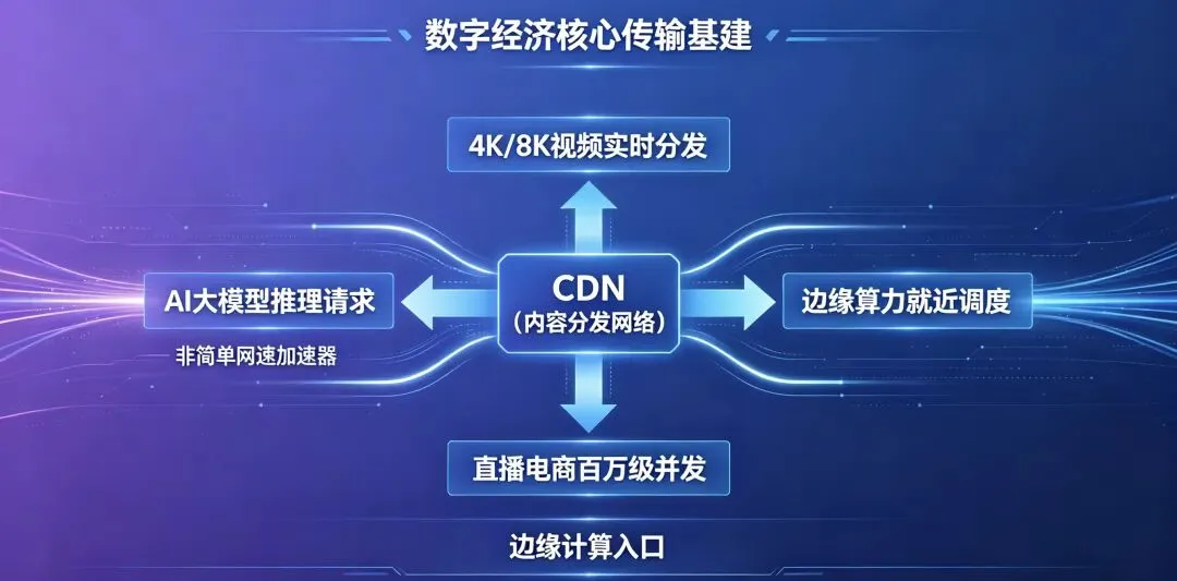 当 AI 大模型的推理请求、4K/8K 视频的实时分发、直播电商的百万级并发、边缘算力的就近调度,都在同一条网络通道里交汇 ——CDN(内容分发网络)早已不是简单的 “网速加速器”,而是数字经济的核心传输基建与边缘计算入口。