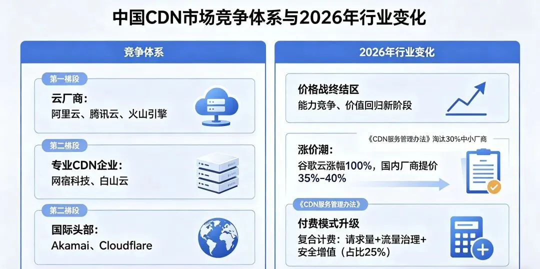 中国 CDN 市场形成 “云厂商 + 专业 CDN 企业 + 国际头部” 的三层竞争体系: