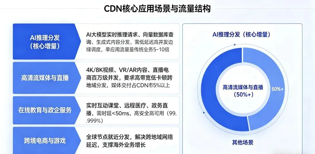 CDN 需求已从传统网页加速,全面渗透至AI、流媒体、直播电商、在线教育、政企服务五大核心场景,流量结构发生质变: