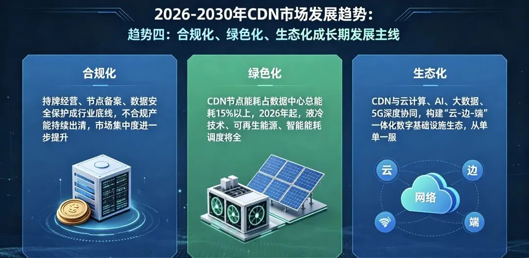 - 绿色化:CDN 节点能耗占数据中心总能耗 15% 以上,2026 年起,液冷技术、可再生能源、智能能耗调度将全面普及,推动行业低碳转型;
