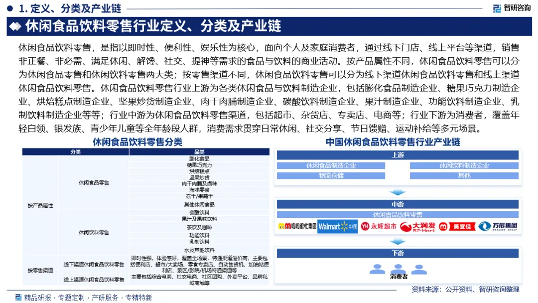 产业链核心节点:休闲食品饮料零售行业上游为各类休闲食品与饮料制造企业,包括膨化食品制造企业、糖果巧克力制造企业、烘焙糕点制造企业、坚果炒货制造企业、肉干肉脯制造企业、碳酸饮料制造企业、果汁制造企业、功能饮料制造企业、乳制饮料制造企业等等;行业中游为休闲食品饮料零售渠道,包括超市、杂货店、专卖店、电商等;行业下游为消费者,覆盖年轻白领、银发族、青少年儿童等全年龄段人群,消费需求贯穿日常休闲、社交分享、节日馈赠、运动补给等多元场景。