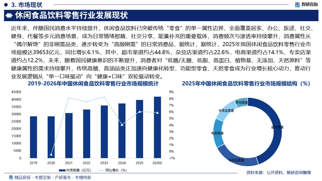 休闲食品饮料零售,是指以即时性、便利性、娱乐性为核心,面向个人及家庭消费者,通过线下门店、线上平台等渠道,销售非正餐、非必需、满足休闲、解馋、社交、提神等需求的食品与饮料的商业活动。近年来,伴随国民消费水平持续提升,休闲食品饮料已突破传统“零食”的单一属性边界,全面覆盖居家、办公、旅途、社交、健身、代餐等多元消费场景,成为日常情绪慰藉、社交分享、能量补充的重要载体,消费频次与渗透率持续攀升,消费属性从“偶尔解馋”的非刚需品类,逐步转变为“高频刚需”的日常消费品,据统计,据统计,2025年我国休闲食品饮料零售行业市场规模达39653亿元,同比增长6.1%,其中,超市渠道约占44.8%,杂货店渠道约占22.6%,电商渠道约占14.1%,专卖店渠道约占12.2%。