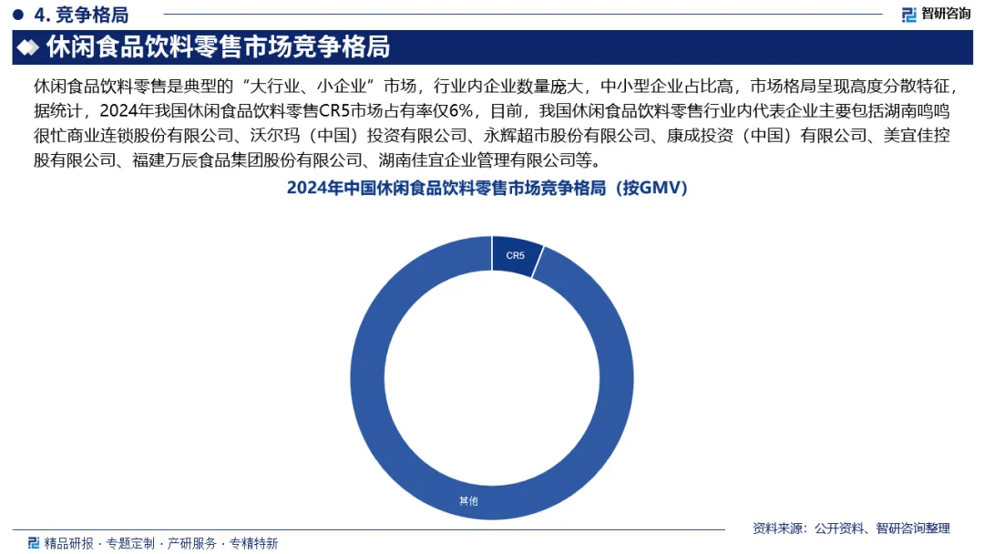 市场竞争格局:休闲食品饮料零售是典型的“大行业、小企业”市场,行业内企业数量庞大,中小型企业占比高,市场格局呈现高度分散特征,据统计,2024年我国休闲食品饮料零售CR5市场占有率仅6%,目前,我国休闲食品饮料零售行业内代表企业主要包括湖南鸣鸣很忙商业连锁股份有限公司、沃尔玛(中国)投资有限公司、永辉超市股份有限公司、康成投资(中国)有限公司、美宜佳控股有限公司、福建万辰食品集团股份有限公司、湖南佳宜企业管理有限公司等。