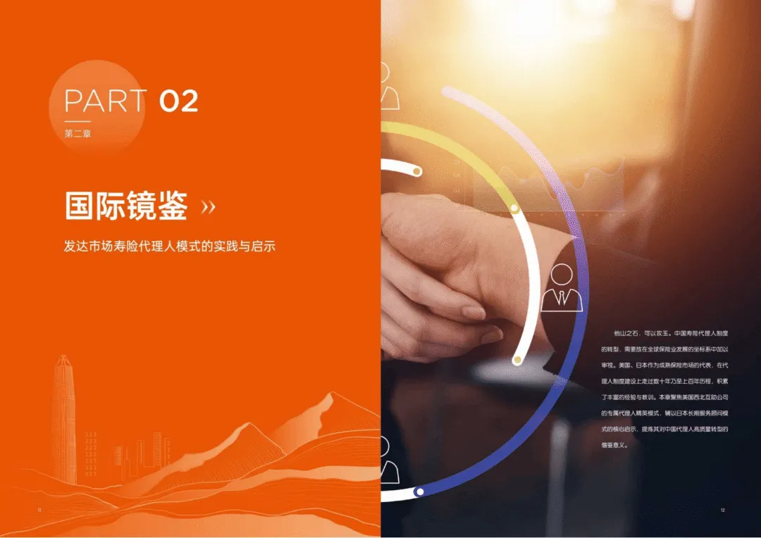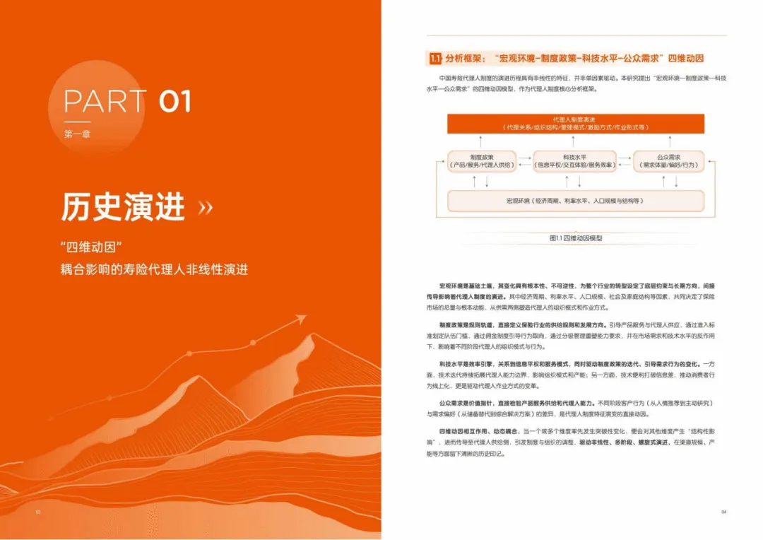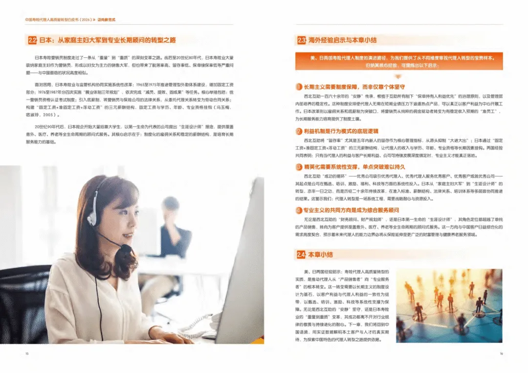 报告以“宏观环境、制度政策、科技水平、公众需求”四维动因,将行业发展划分为四个阶段,当前行业进入深度调整期,代理人规模收缩但人均产能显著提升,呈现“减量提质”的转型特征。同时借鉴美国西北互助精英化、日本职业化转型经验,得出长期主义、利益重构、系统赋能、专业服务是转型关键方向。