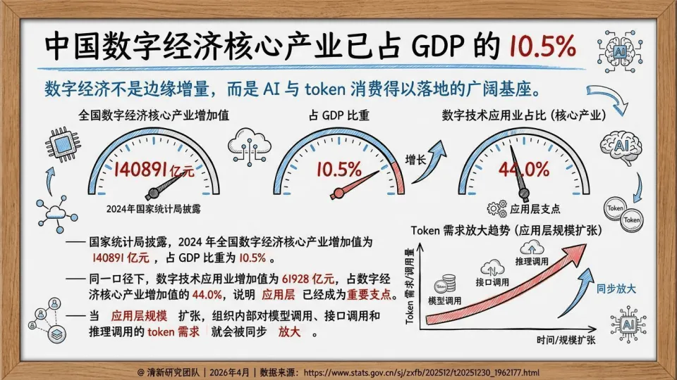 数字经济、算力供给与企业AI渗透率提升,共同推动Token消费规模化。数字经济核心产业占GDP比重达10.5%,算力机架、智能算力与生成式AI备案数同步增长,为Token消费提供坚实基础;企业AI使用比例持续爬升,Token从试验品变为常规消耗品。