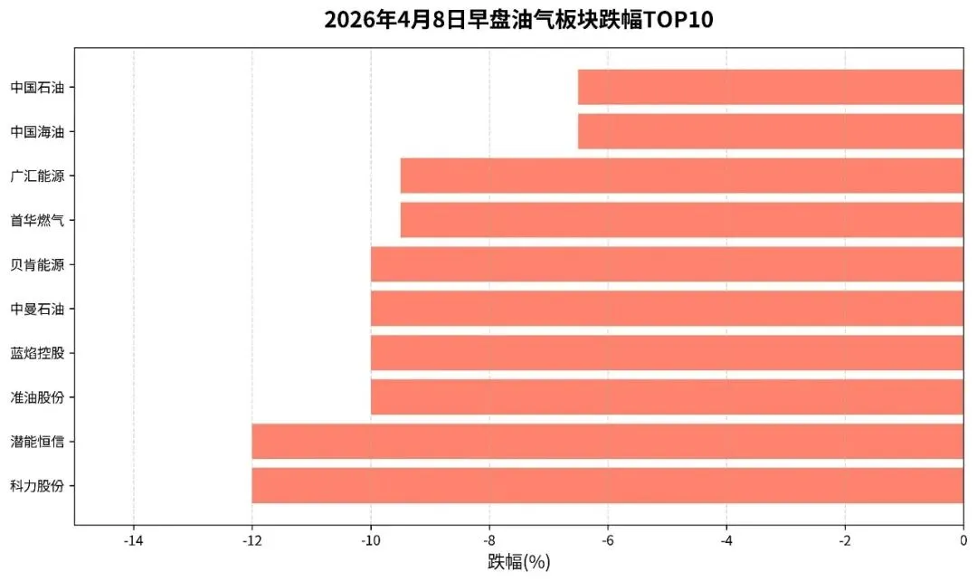 受美伊临时停火协议影响,国际油价暴跌带动A股油气板块集体重挫: