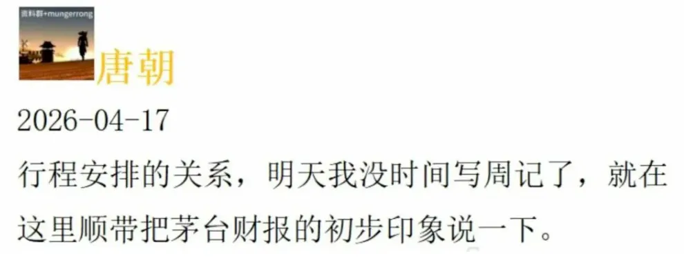 行程安排的关系,明天我没时间写周记了,就在这里顺带把茅台财报的初步印象说一下。